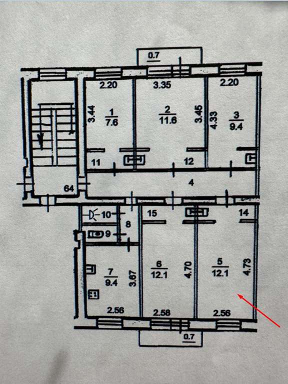 Размеры 2,56 х 4,73 до перегородки, где раковина. С другой стороны длина комнаты 5,5 м, т. к. перегородка сейчас убрана. Поэтому на плане указано 12,1 кв. м, а в документе на собственность 14 кв. м.